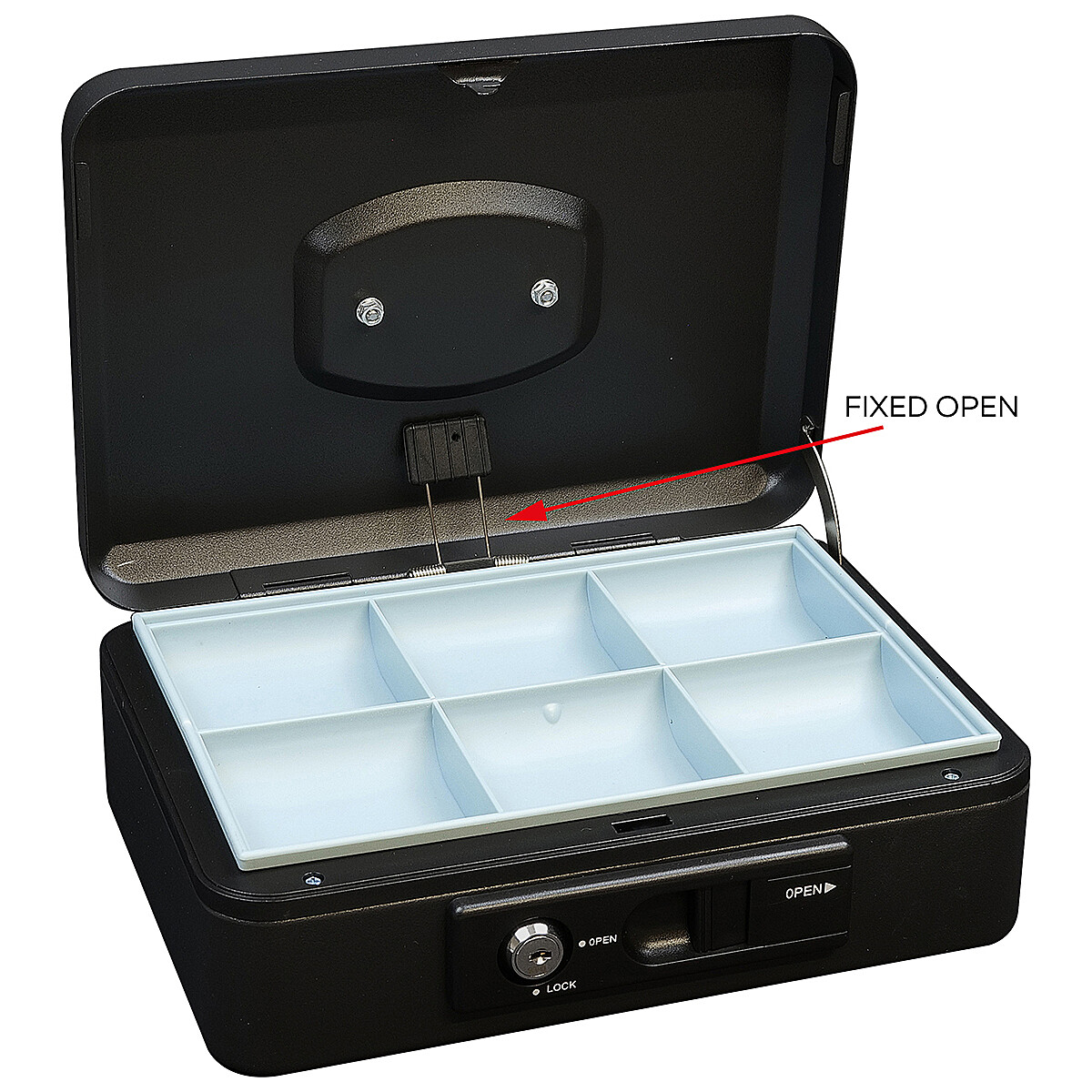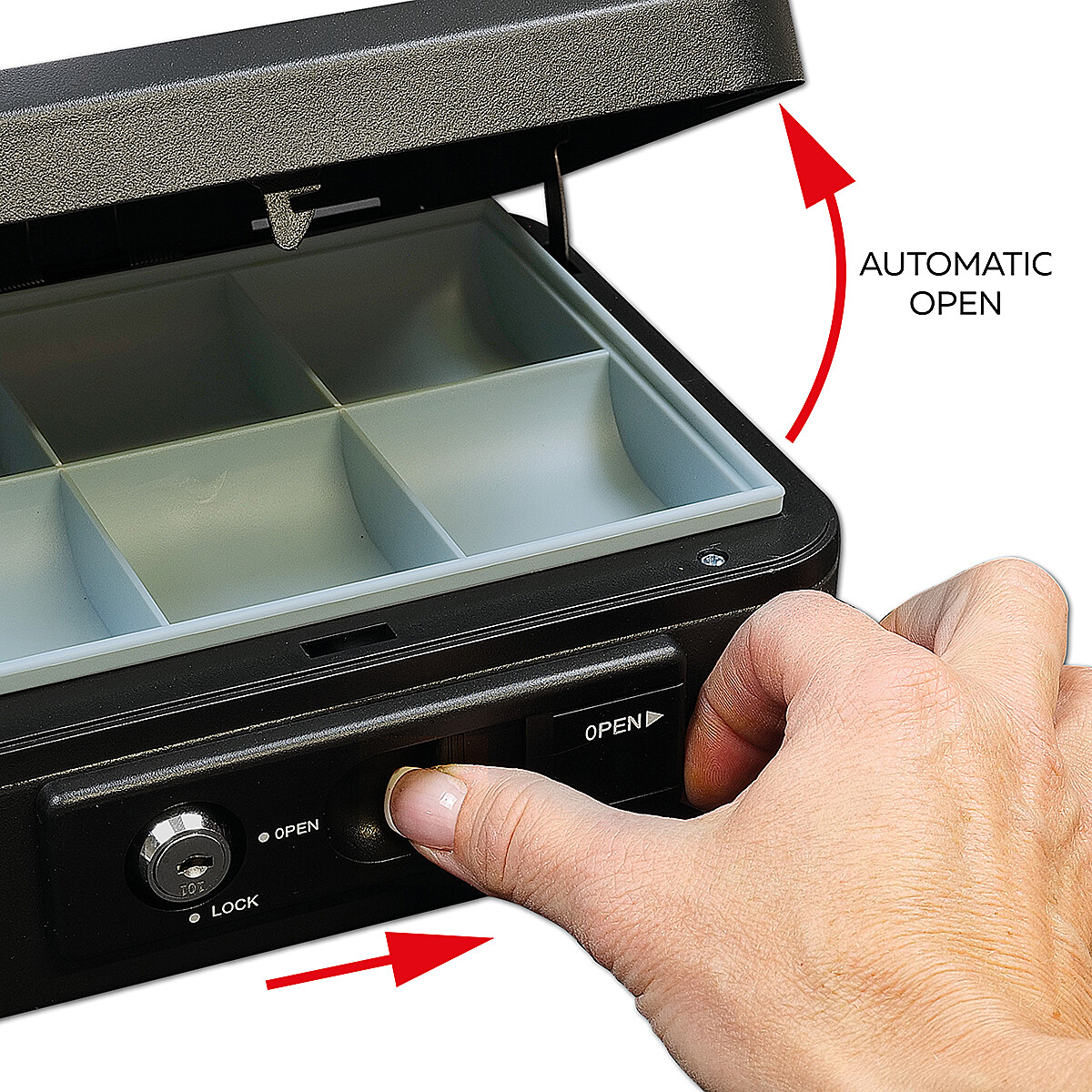 Čelična kasica opremljena je vanjskom polugom za praktično automatsko otvaranje poklopca. Nakon zatvaranja, poklopac se automatski zaključava, omogućujući siguran transport bez potrebe za ključem.