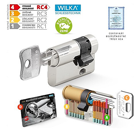 Wilka sigurnosni cilindar sa 6 pinova i zaštitom od bušenja. Konstrukcija cilindra: 6 cilindara, 1. cilindar izrađen od kaljenog čelika, tijelo cilindra i cilindar opremljeni su čeličnim klinovima protiv bušenja. Uz cilindar isporučujemo zaštićeni profil ključa, koji nije slobodno dostupan. Za izradu duplikata ključa potrebno je pokazati osobnu iskaznicu. Preporučujemo ga za područja s najvišom razinom sigurnosti.