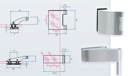 Šarke za potpuno staklene okove serije LR 11.87.72, CT 7000 - brušeni nehrđajući čelik, SP 102 - brušeni nehrđajući čelik, SP 103 - brušeni nehrđajući čelik, JNF B i E - brušeni nehrđajući čelik