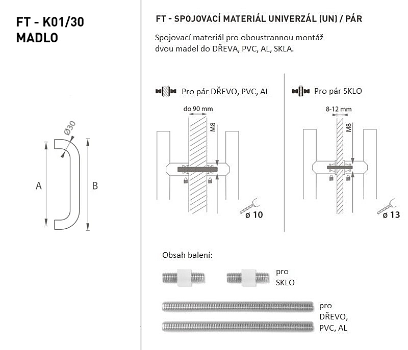 UNIVERSAL (UN) set sadrži pričvršćivače za dvostranu ugradnju dviju ručki u drvu, PVC-u, AL-u, staklu.