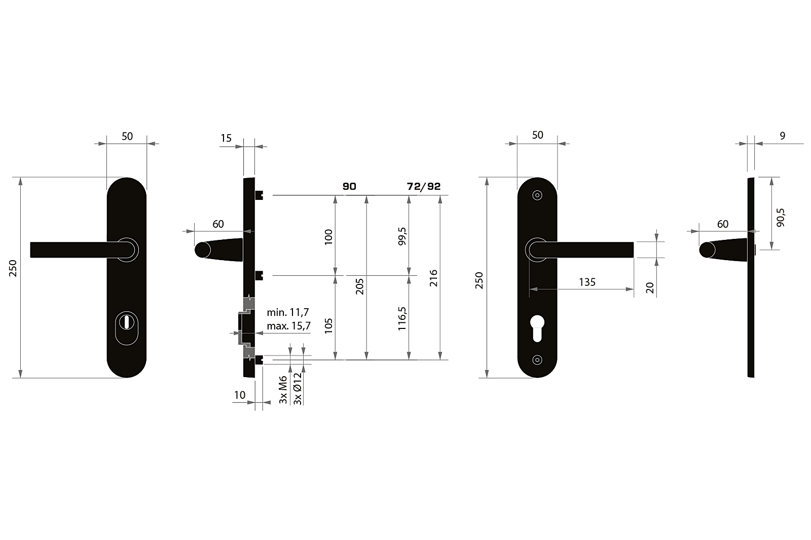 Okov je pričvršćen s tri sigurnosna vijka , pri čemu je središnji vijak skriven ispod poklopca. Model je dostupan u razmacima od 72 mm, 90 mm i 92 mm , što ga čini jednostavnim za prilagodbu različitim vrstama vrata.