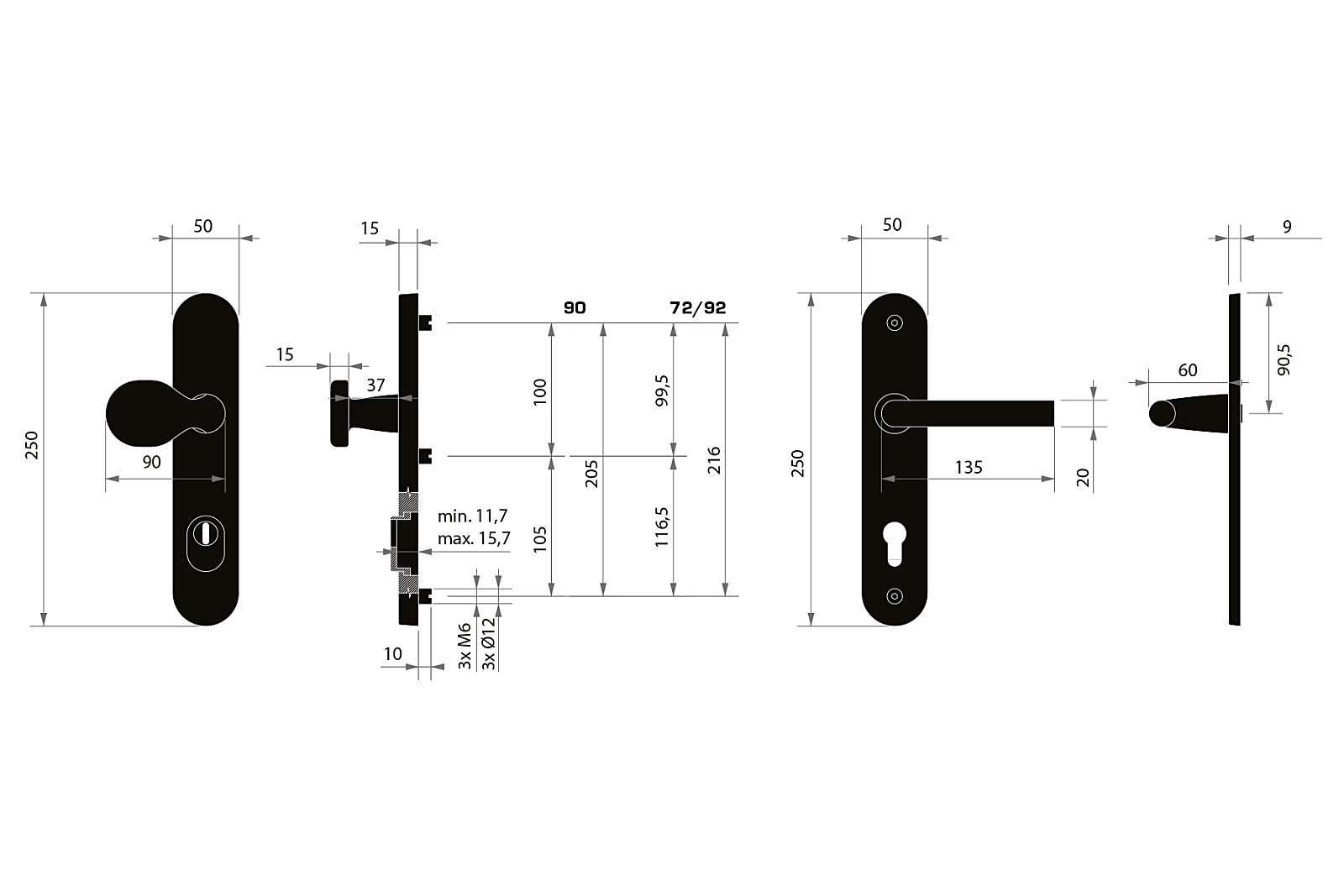 Okov je pričvršćen s tri sigurnosna vijka , pri čemu je središnji vijak skriven ispod poklopca. Model je dostupan u razmacima od 72 mm, 90 mm i 92 mm , što ga čini jednostavnim za prilagodbu različitim vrstama vrata.