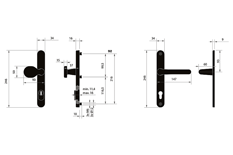 Za sigurnosne okove potrebno je znati udaljenost između osi ručke i osi ključa (razmak). Standardna udaljenost je 72, 90 ili 92 mm. Okovi su standardni za debljine vrata od 65 do 75 mm.