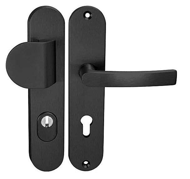 Štitna ručka za ulazna i protuprovalna vrata s ovalnim sigurnosnim štitom s poklopcem cilindra izrađena je od aluminija i površinski je obrađena. Ovalni štit ima dimenzije 52 mm x 242 mm i debljinu 15 mm.