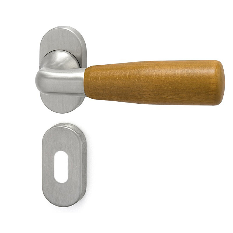 Ovaj okov za vrata dostupan je u varijanti sa ovalnom rozetom za obični ključ (BB), cilindrični uložak (PZ) ili sa WC bravom sa indikatorom brave za kupatilo ili WC sa drvenom ručkom u bijeloj boji drvo, prirodno drvo, trešnja, mahagonij, bagrem ili ebanovina.