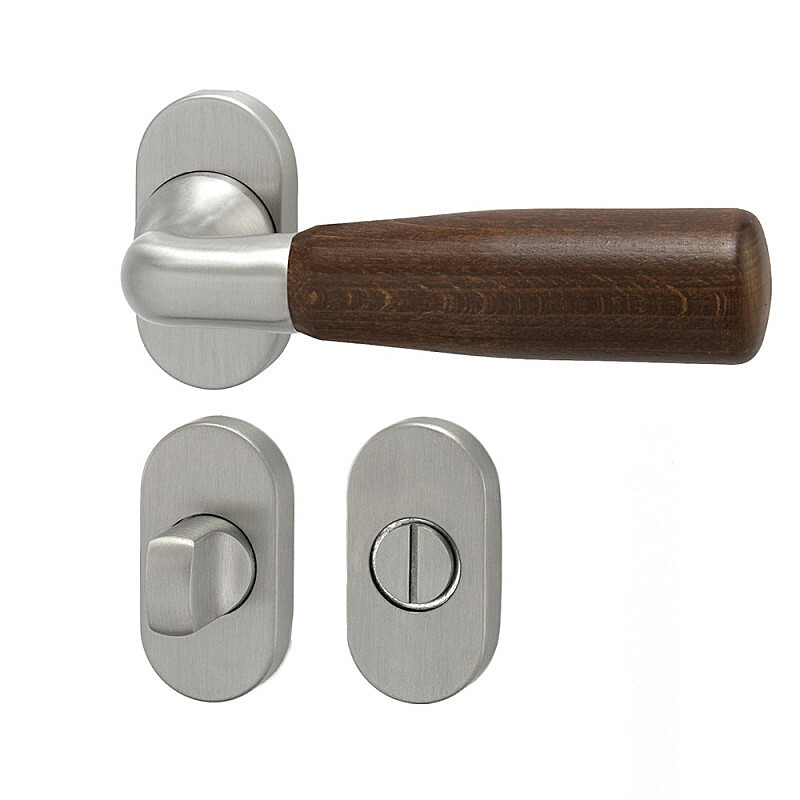Ovaj okov za vrata dostupan je u izvedbi s ovalnom rozetom za obični ključ (BB), cilindarski uložak (PZ) ili s WC bravom s indikatorom brave za kupaonicu ili wc s drvenom ručkom u bijeloj boji drvo, prirodno drvo, trešnja, mahagonij, bagrem ili ebanovina.
