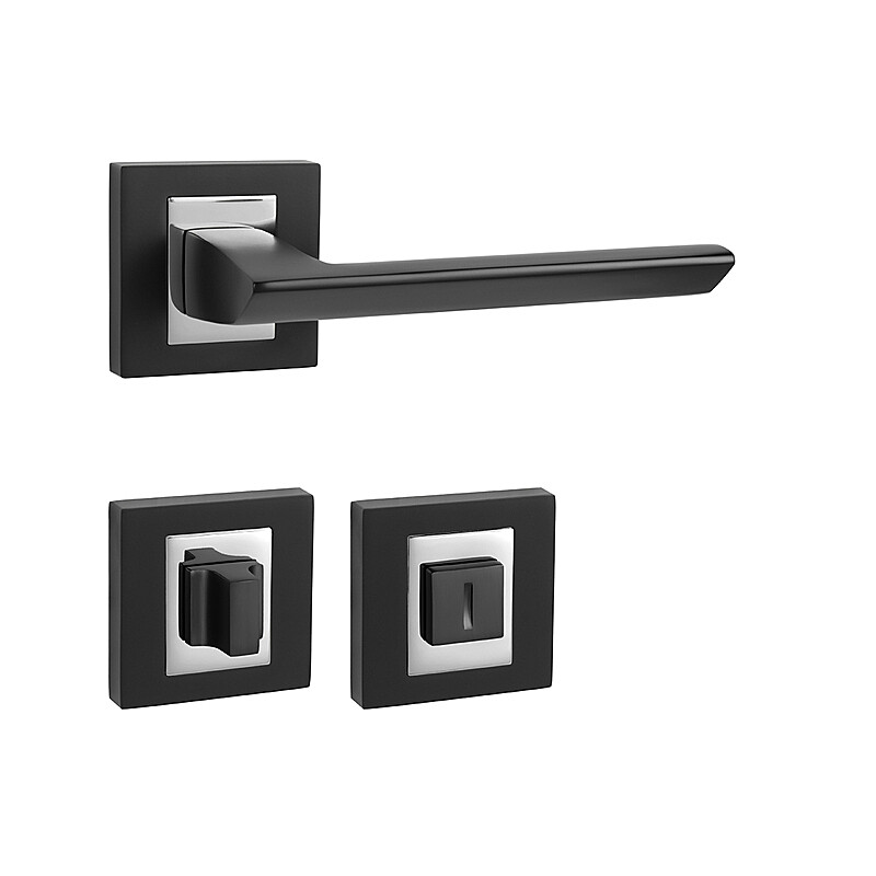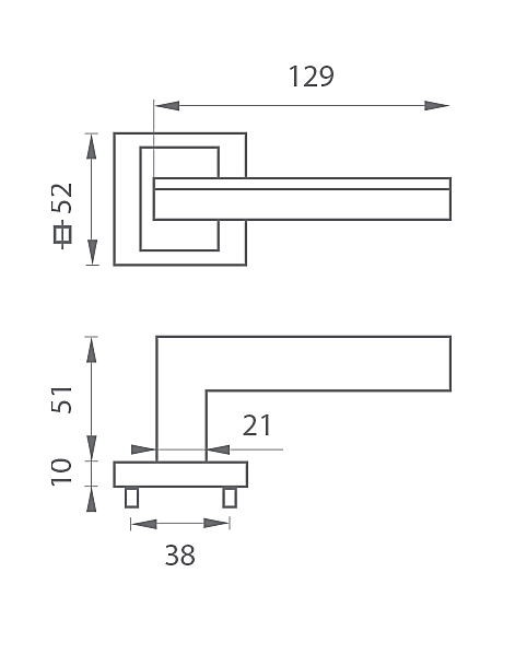 Rozetna kvaka na unutarnjim vratima s četvrtastom rozetom izrađena je lijevanjem od visokokvalitetnih legura cinka i aluminija te je površinski obrađena. Rozeta je dimenzija 52 mm x 52 mm i debljine 10 mm. Drška je površinski galvanizirana i odlikuje se visokom otpornošću na koroziju. Armature su testirane na 100.000 ciklusa.