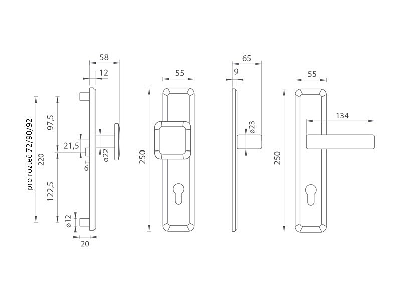 Štit kvaka za ulazna i protuprovalna vrata s ojačanim kvadratnim štitom bez preklopa košuljice cilindra izrađena je od visokokvalitetnog materijala - mesinga i površinski je obrađena. Pravokutni štit je dimenzija 55 mm x 250 mm i debljine 12 mm.