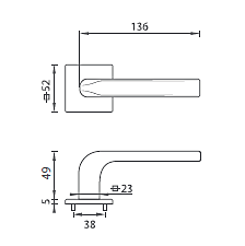 Rozetna kvaka na unutarnjim vratima s četvrtastom rozetom izrađena je od visokokvalitetnih materijala - mesinga i površinski je obrađena. Rozeta je dimenzija 52 mm x 52 mm i debljine je samo 5 mm.