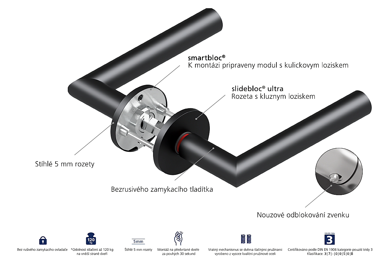 Zahvaljujući inovativnoj funkciji zaključavanja zasuna, sustav smartbloc® nudi sigurno rješenje za zaključavanje vrata bez potrebe za korištenjem tradicionalne brave. Ovaj jedinstveni sustav omogućuje jednostavno i brzo zaključavanje vrata pritiskom na ručku, čime se pruža dodatna sigurnost. Ova značajka jednostavna za korištenje posebno je praktična u sobama u kojima je privatnost ili sigurnost redovito potrebna u kratkom roku.