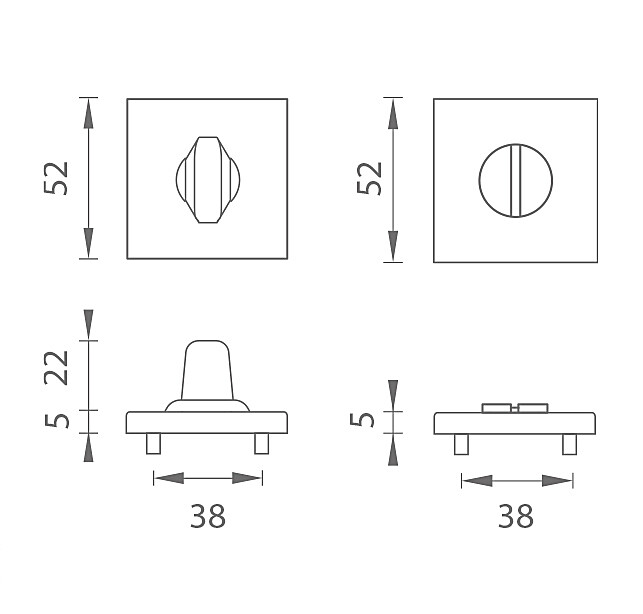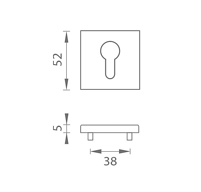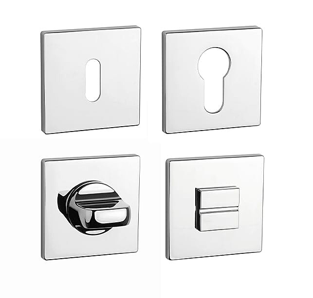 Rozeta ima dimenzije 52x52 mm, debljinu 5 mm i ovalni otvor za unutarnji ključ (BB), otvor za cilindarski uložak (PZ), WC set s ugrađenim ključem.