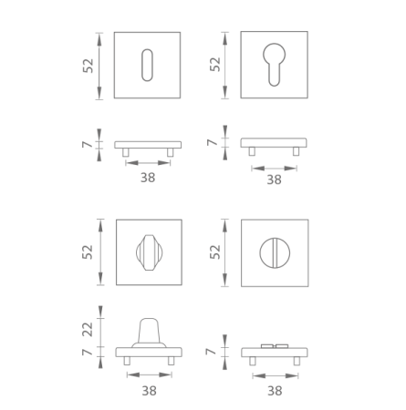 Četvrtasta rozeta izrađena je od visokokvalitetnog materijala - zamaka i površinski je obrađena. Rozeta je dimenzija 52 x 52 mm, debljine 7 mm i ima ovalni otvor za unutarnji ključ (BB), otvor za cilindarski uložak (PZ), WC garnitura sa ugrađenim ključem. Paket sadrži 2 komada rozeta (par) a wc rozete su u paketu kao set.