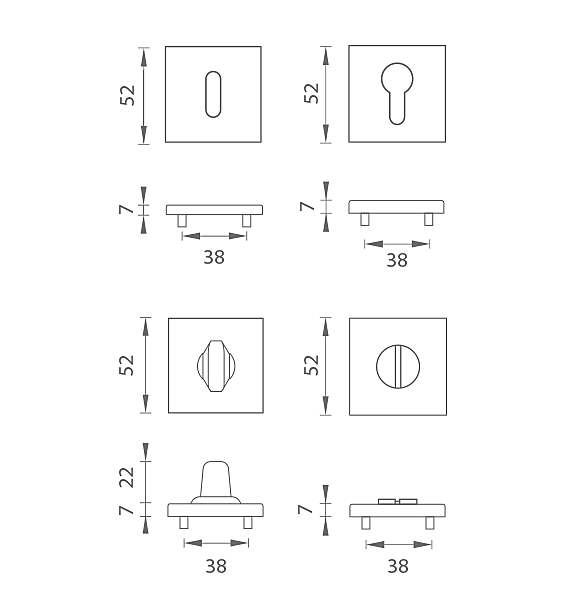 Četvrtasta rozeta izrađena je od visokokvalitetnog materijala - zamaka i površinski je obrađena. Rozeta je dimenzija 52 x 52 mm, debljine 7 mm i ima ovalni otvor za unutarnji ključ (BB), otvor za cilindarski uložak (PZ), WC garnitura sa ugrađenim ključem. Paket sadrži 2 komada rozeta (par) a wc rozete su u paketu kao set.