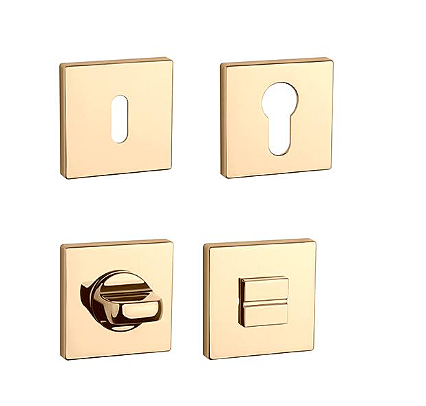 Četvrtasta rozeta izrađena je od visokokvalitetnog materijala - zamaka i površinski je obrađena. Rozeta je dimenzija 52 x 52 mm, debljine 7 mm i ima ovalni otvor za unutarnji ključ (BB), otvor za cilindarski umetak (PZ), WC garnitura sa ugrađenim ključem. Paket sadrži 2 komada rozeta (par) a wc rozete su u paketu kao set.
