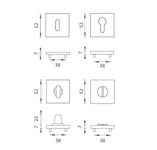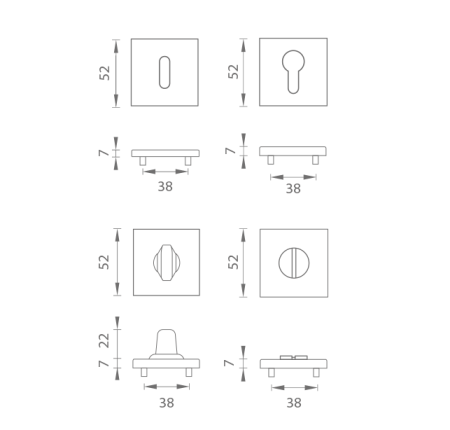 Četvrtasta rozeta izrađena je od visokokvalitetnog materijala - zamaka i površinski je obrađena. Rozeta je dimenzija 52 x 52 mm, debljine 7 mm i ima ovalni otvor za unutarnji ključ (BB), otvor za cilindarski uložak (PZ), WC garnitura sa ugrađenim ključem. Paket sadrži 2 komada rozeta (par) a wc rozete su u paketu kao set.