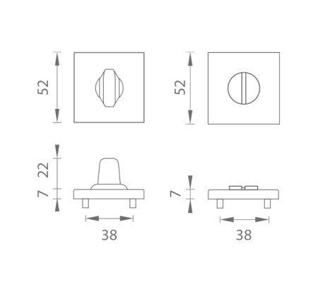 Četvrtasta rozeta izrađena je od visokokvalitetnog materijala - zamaka i površinski je obrađena. Rozeta je dimenzija 52x52 mm, debljine 7 mm i ima ovalni otvor za unutarnji ključ (BB), otvor za cilindarski umetak (PZ), WC garnitura sa ugrađenim ključem. Paket sadrži 2 komada rozeta (par) a wc rozete su u paketu kao set.