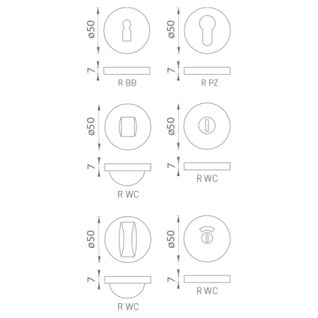 Rozeta je promjera 50 mm, debljine 7 mm i ima ovalni otvor za unutarnji ključ (BB), otvor za cilindarski uložak (PZ), WC garnitura sa ugrađenim ključem i indikatorom.