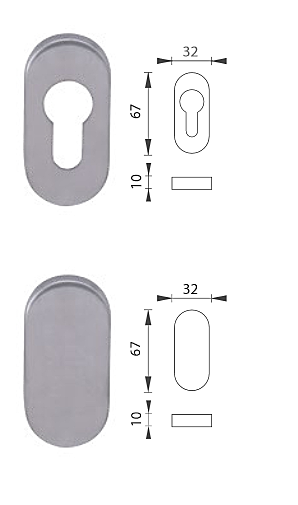 Rozeta je dimenzija 32 mm x 67 mm, debljine 10 mm i rupom za cilindarski uložak (PZ) ili rozeta bez rupe tzv. slijepi utikač.