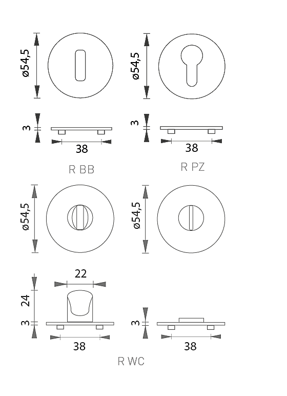 Ovalni otvor za unutarnji ključ (BB), otvor za cilindar (PZ) ili WC set s ugrađenim ključem.