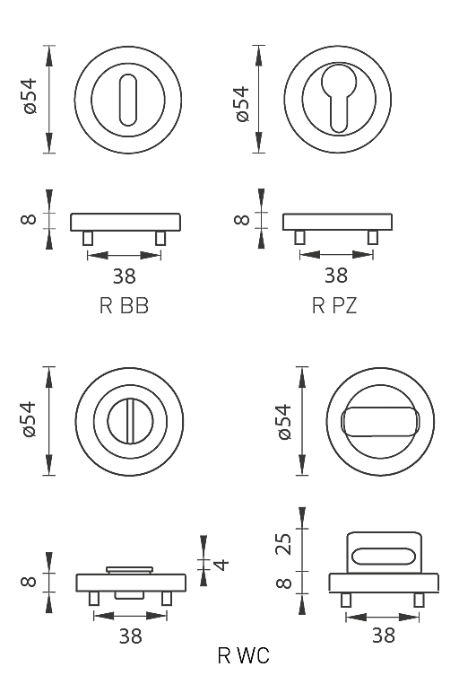 Ovalni otvor za unutarnji ključ (BB), otvor za cilindar (PZ) ili WC set s ugrađenim ključem.