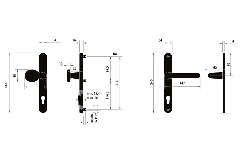 Za sigurnosne okove potrebno je znati udaljenost između osi ručke i osi ključa (razmak). Standardna udaljenost je 72, 90 ili 92 mm. Okovi su standardni za debljine vrata od 65 do 75 mm.